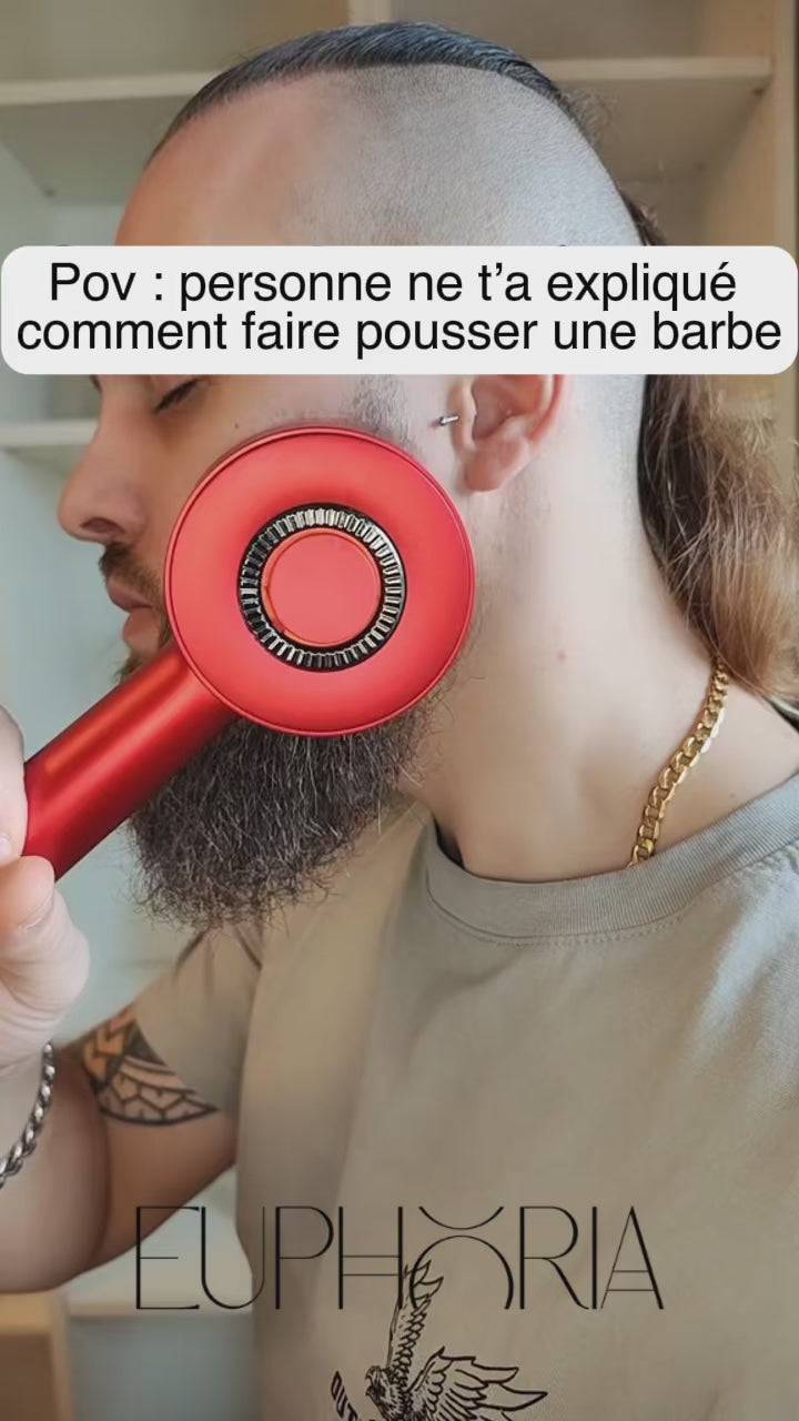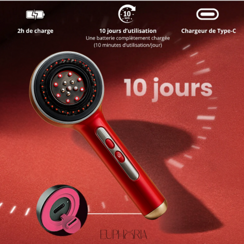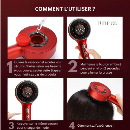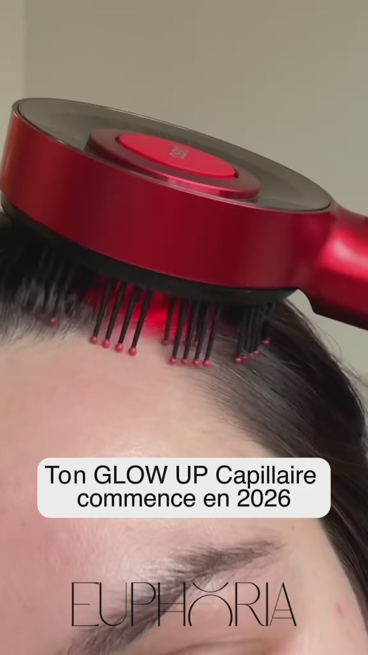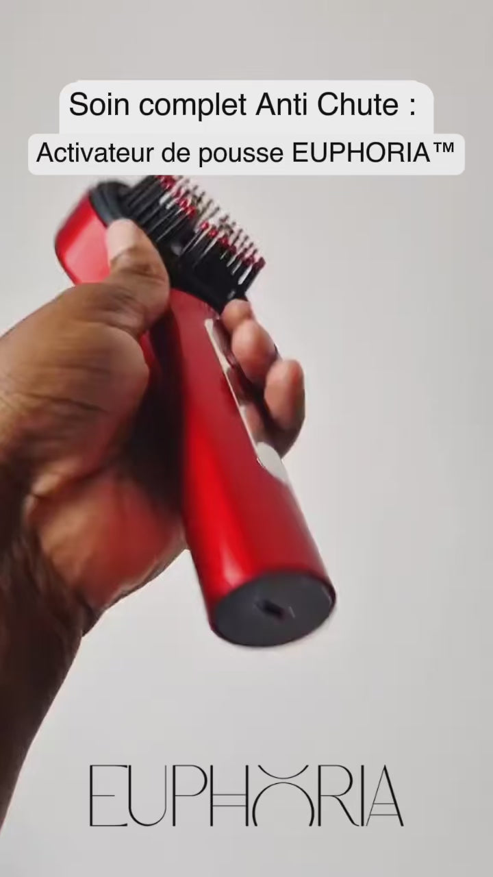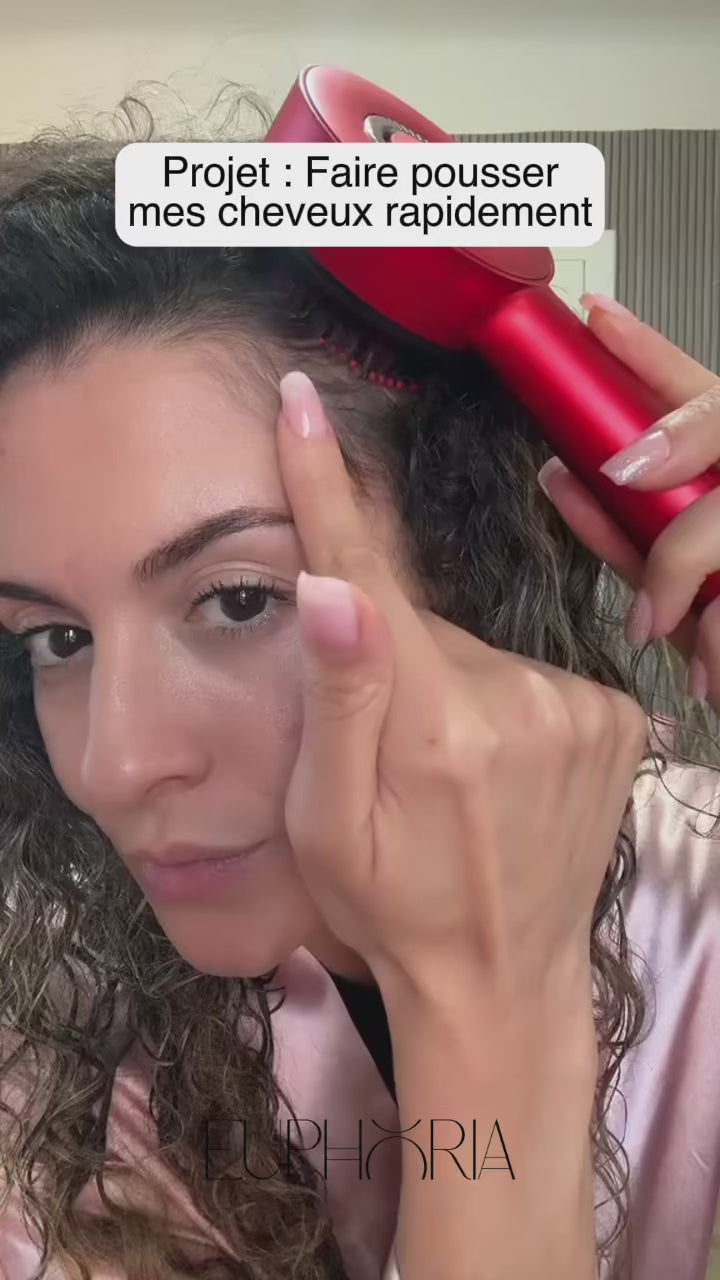 Le Pack Euphoria™ est un duo composé d’une brosse stimulante LED rouge et d’un sérum huileux activateur, conçu pour stimuler la pousse, renforcer les cheveux depuis la racine et réduire la chute grâce à une combinaison de massage, microcirculation et technologie LED.