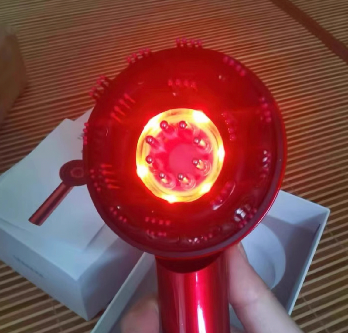 La brosse utilise des lumières LED rouges pour stimuler le cuir chevelu et la microcirculation, tandis que le massage augmente l’absorption du sérum huileux, favorisant la pénétration des actifs.