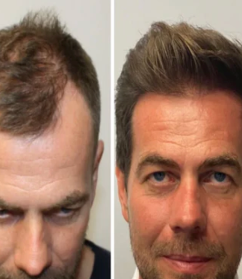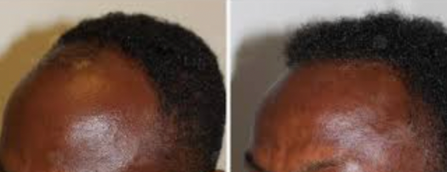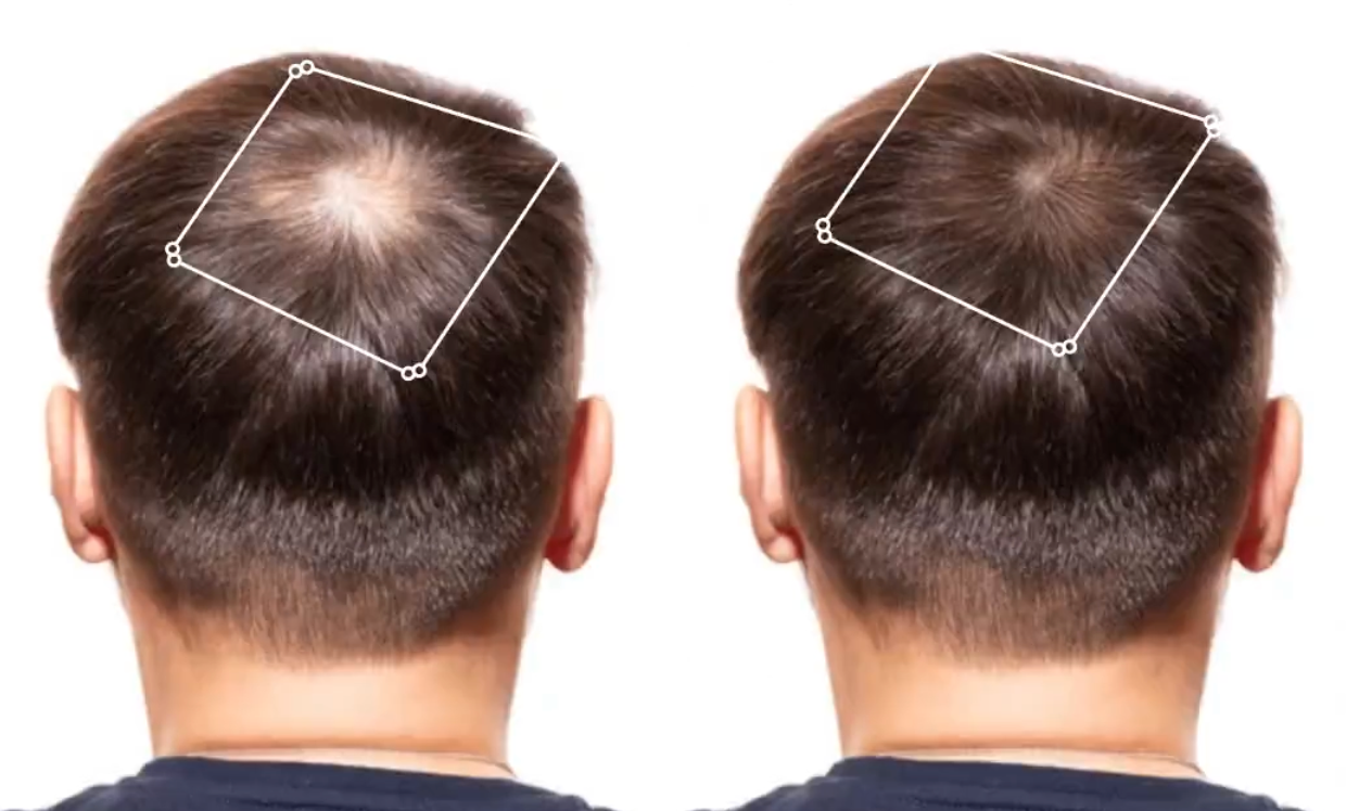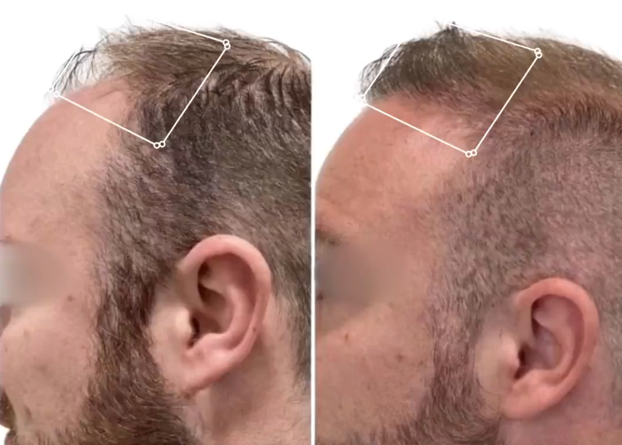 → Avant : Tempes qui reculent, densité qui diminue, chute progressive, zones clairsemées, cheveux de plus en plus fins, alopécie de traction...