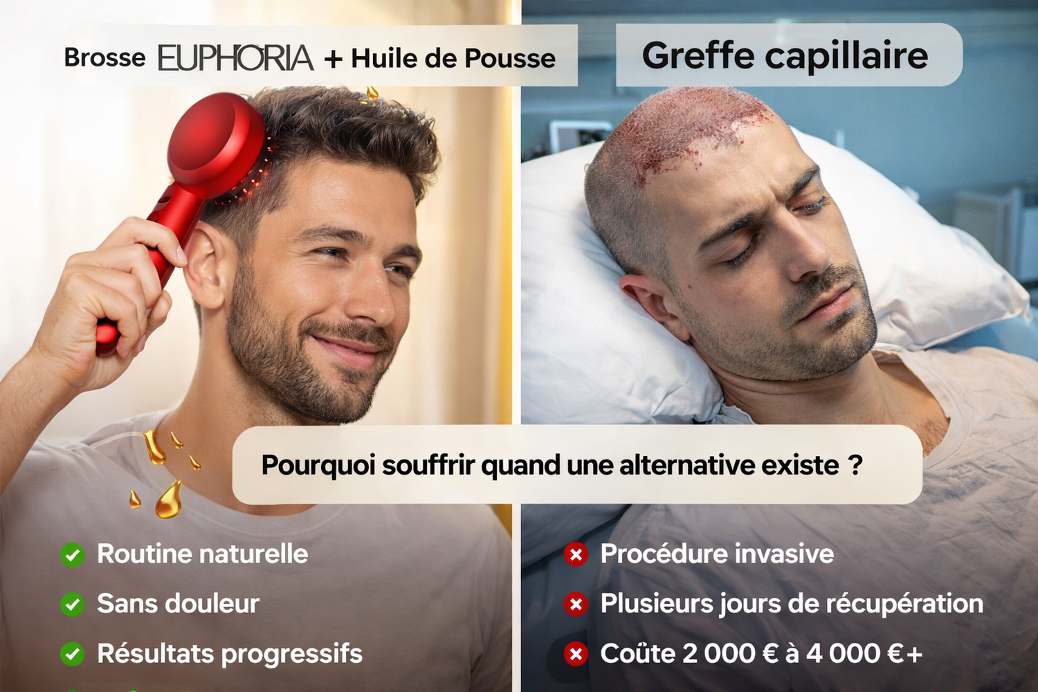 la brosse LED Euphoria combinée à l’huile de pousse agit directement sur le cuir chevelu.