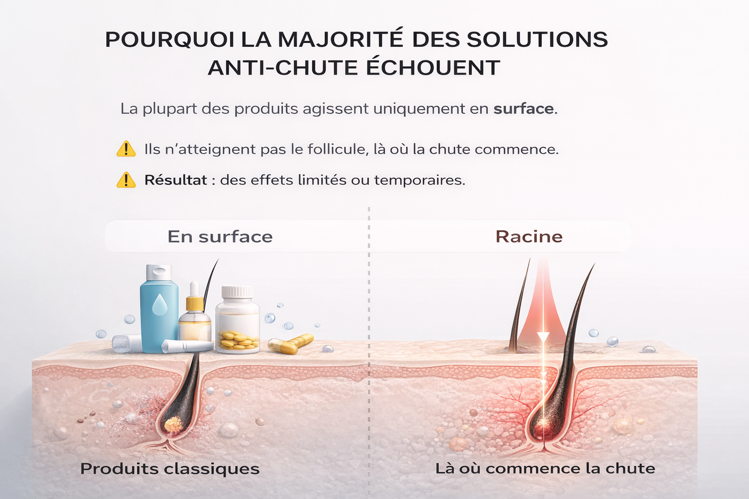 👉 Ils n’atteignent pas le follicule, là où la chute commence.