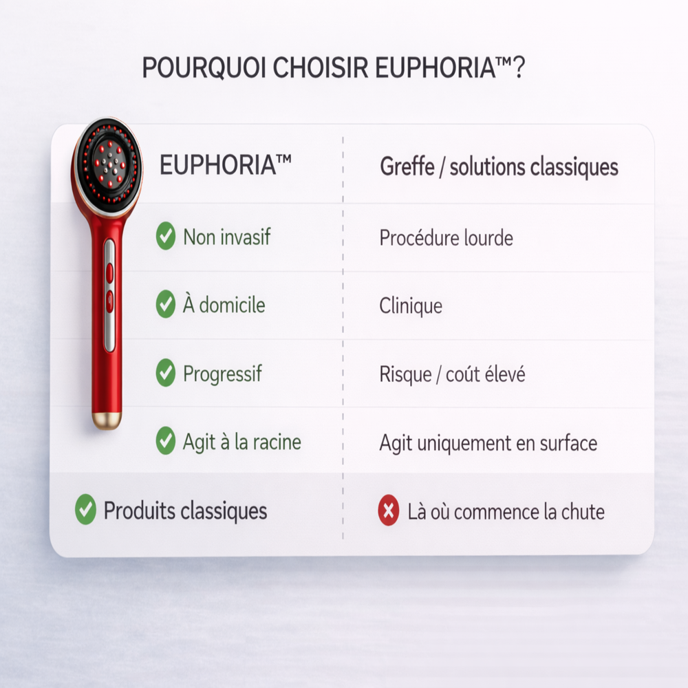 Le Pack Euphoria™ est un duo composé d’une brosse stimulante LED rouge et d’un sérum huileux activateur, conçu pour stimuler la pousse, renforcer les cheveux depuis la racine et réduire la chute grâce à une combinaison de massage, microcirculation et technologie LED.